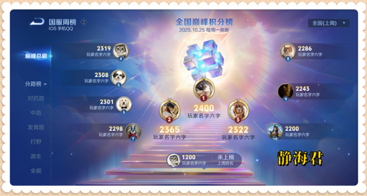 考虑到有部分玩家对巅峰分路榜有需求,所以原有的分路榜单依旧保留,但上榜规则做了调整:
