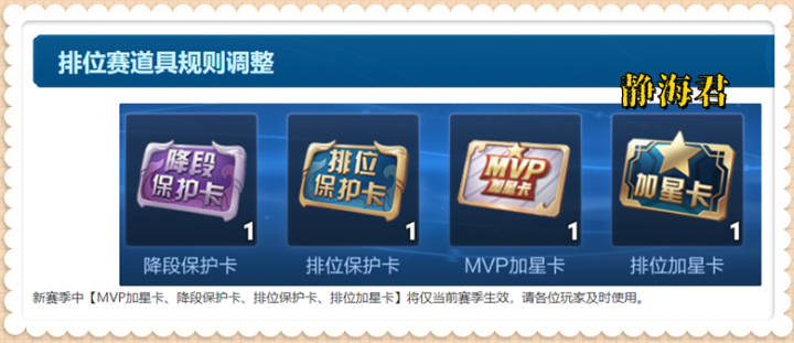 第一个调整:在新赛季,降段保护卡、排位保护卡、MVP加星卡、排位加星卡等道具,都只能在当前赛季生效,想要像之前一样囤到下个赛季是不可能了。