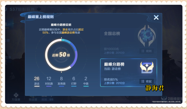 三,系统会根据玩家近50场比赛的自选分路来进行分类,如有分路的场次超过50%,则确定该分路上榜;如没有分路超过50%,则会自动归属到全能榜。